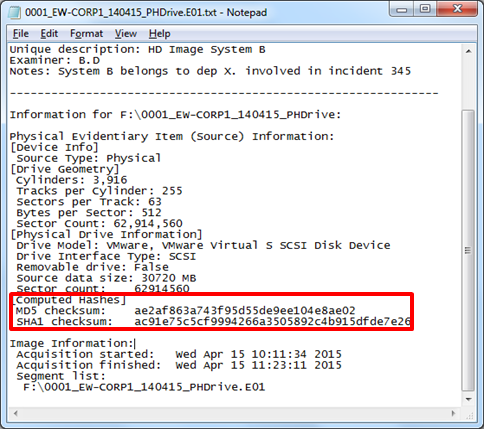 root@caine:~#md5sum /mnt/target/08122016\_1500\_WEB001.img > /mnt/target/08122016\_1500\_WEB001.img.md5 root@caine:~# cat /mnt/target/\*.md5 6a5346b9425925ed230e32c9a0b510f7 /mnt/target/08122016\_1500\_WEB001.img 6a5346b9425925ed230e32c9a0b510f7 /dev/sda root@caine:~# umount /mnt/target/