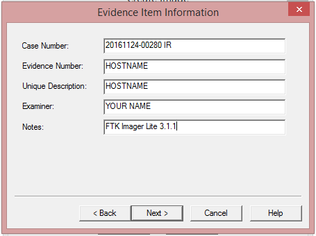 - Provide a name for the image within the Image Filename box. Usually I use this naming convention: DATE_TIME_HOSTNAME. (Example: 08122016_1500_WEB001)