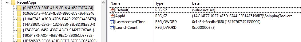Program execution launched on a Win10 system is tracked in the RecentApps key: