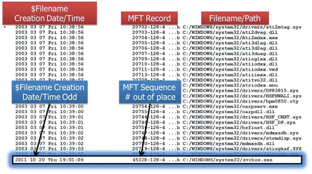 In this image, extracted from a SANS Forensic poster, both creation date and MFT record number are out of place, and identify a possible malicious activity.