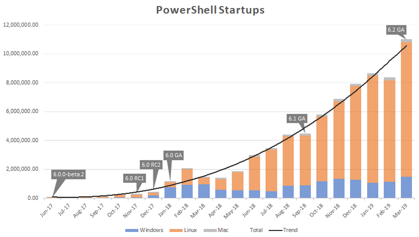 PowerShell Core usage increased significantly in the past two years especially on Linux platforms. Windows usage has stagnated on the other hand for the most part. Microsoft explains the lack of progress on the Windows platform with the existence of PowerShell 5.1 which offers functionality that PowerShell Core does not support