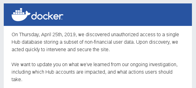 According to a security notice sent late Friday night, Docker became aware of unauthorized access to a Docker Hub database on April 25th, 2019.