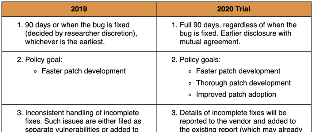 For vulnerabilities reported starting January 1, 2020, we are changing our Disclosure Policy: Full 90 days by default, regardless of when the bug is fixed. Fix a bug in 20 days? We will release all details on Day 90.Fix a bug in 90 days? We will release all details on Day 90.If there is mutual agreement between the vendor and Project Zero, bug reports can be opened to the public before 90 days elapse. For example, a vendor wants to synchronize the opening of our tracker report with their release notes to minimize user confusion and questions. We will try this policy for 12 months, and then consider whether to change it long term.