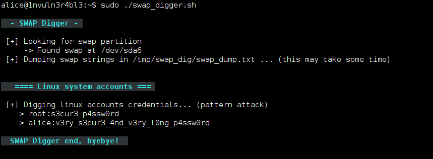 wget https://raw.githubusercontent.com/sevagas/swap_digger/master/swap_digger.sh chmod +x swap_digger.sh sudo ./swap_digger.sh -vx -c