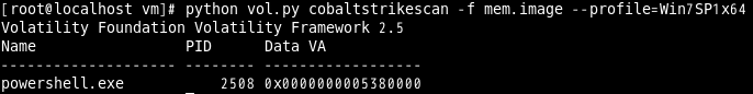 $python vol.py [cobaltstrikescan|cobaltstrikeconfig] –f <memory.image> ––profile=<profile>